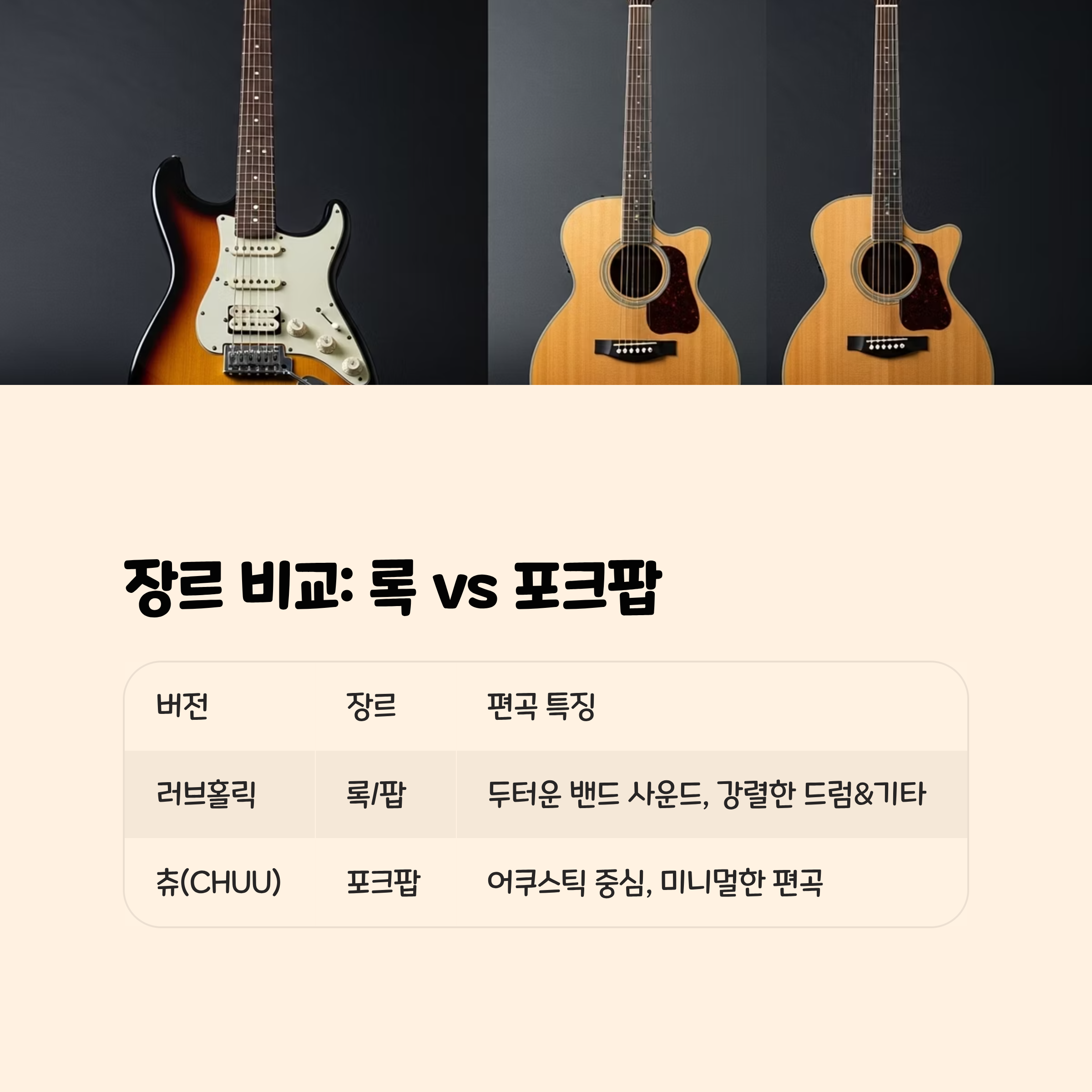 러브홀릭 원곡(2003년)은 록 사운드 기반에 이별과 청춘의 아픔을 강렬하게 그렸습니다. 반면 2025년 츄 리메이크는 포크팝 편곡과 섬세한 음색으로 첫사랑의 설렘과 현실 공감을 강조하며, 시대별 감성 차이를 드러냅니다.