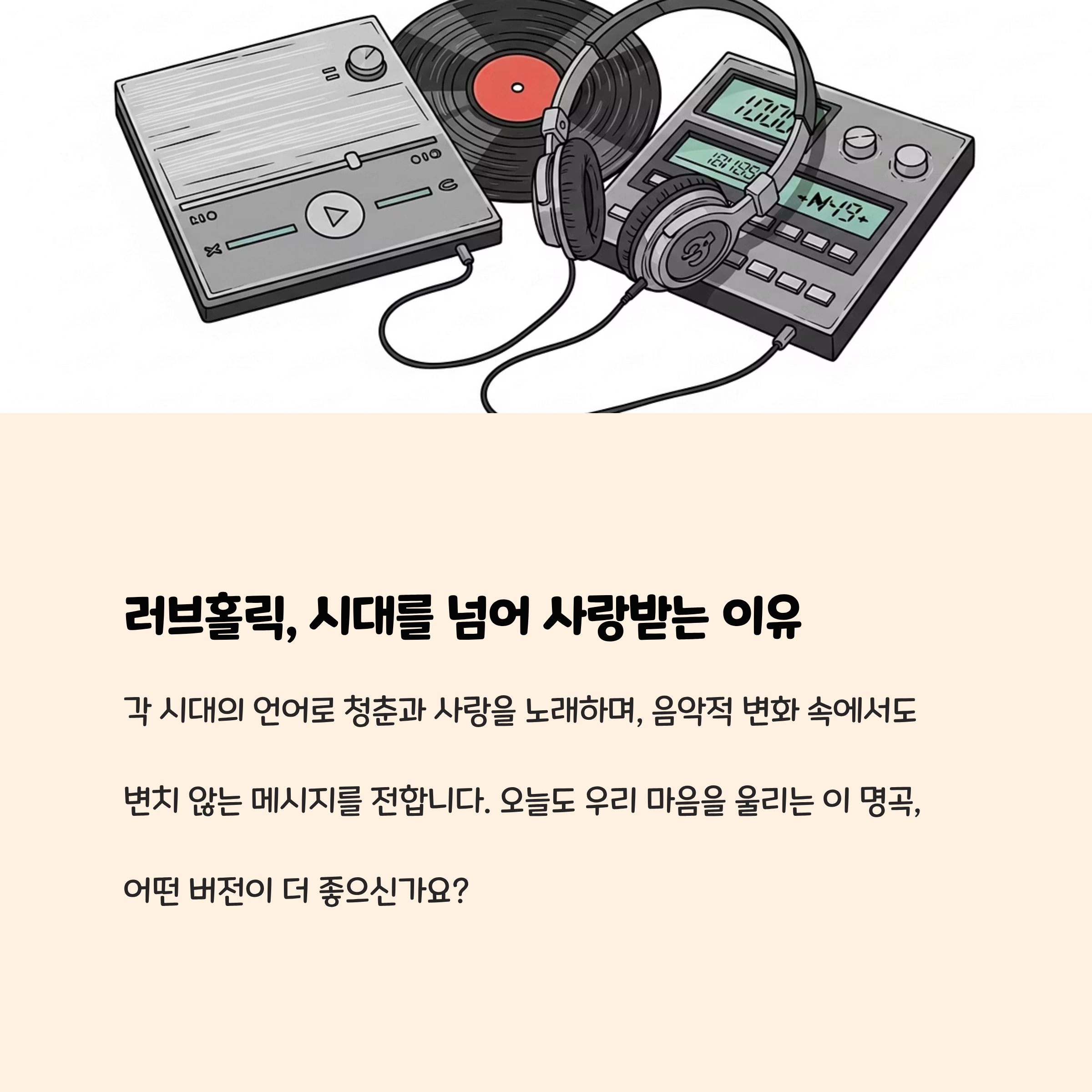 각자의 사랑과 추억이 담기는 노래, 이제는 당신이 주인공입니다. 2003년 러브홀릭 원곡의 진한 감성, 2025년 츄의 산뜻한 해석—당신의 현재 감정에 맞추어 골라 들어보세요. '러브홀릭'이 전하는 위로와 설렘이, 분명히 당신의 고민을 풀어줄 해답이 되어 줄 것입니다.