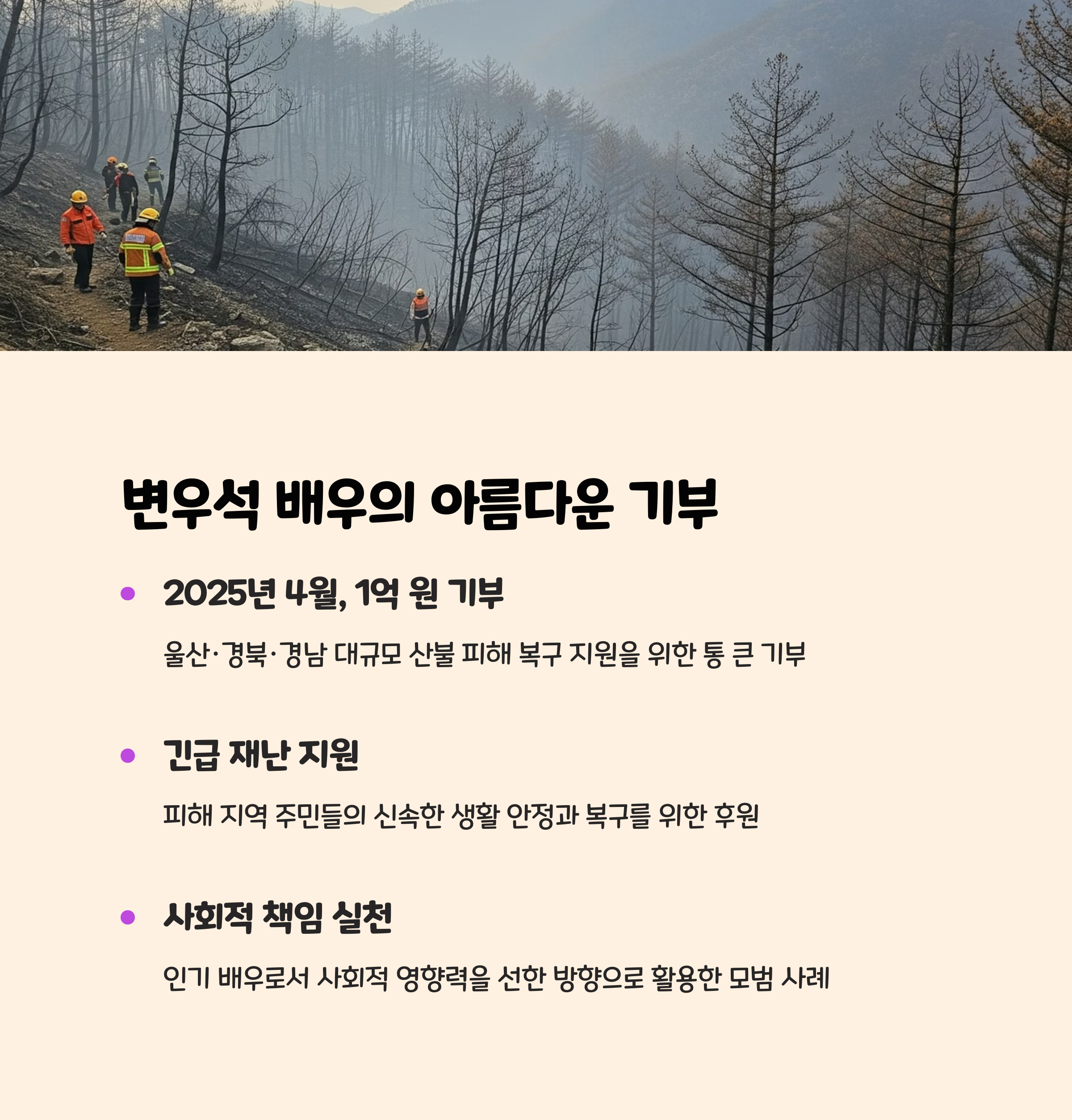 2025년 4월, 울산·경북·경남 지역에서 발생한 대형 산불로 수많은 이웃들이 실의에 빠졌습니다. 배우 변우석은 이 소식을 접하고, 희망브리지에 1억 원을 기부하면서 아너스클럽 정회원으로 이름을 올렸습니다. 이 과정에서 그는 “아너스클럽이라는 뜻깊은 모임에 함께하게 돼 진심으로 감사하다. 작은 마음이지만 힘이 될 수 있다면 언제든 함께하고 싶다”며 진심을 전했습니다.