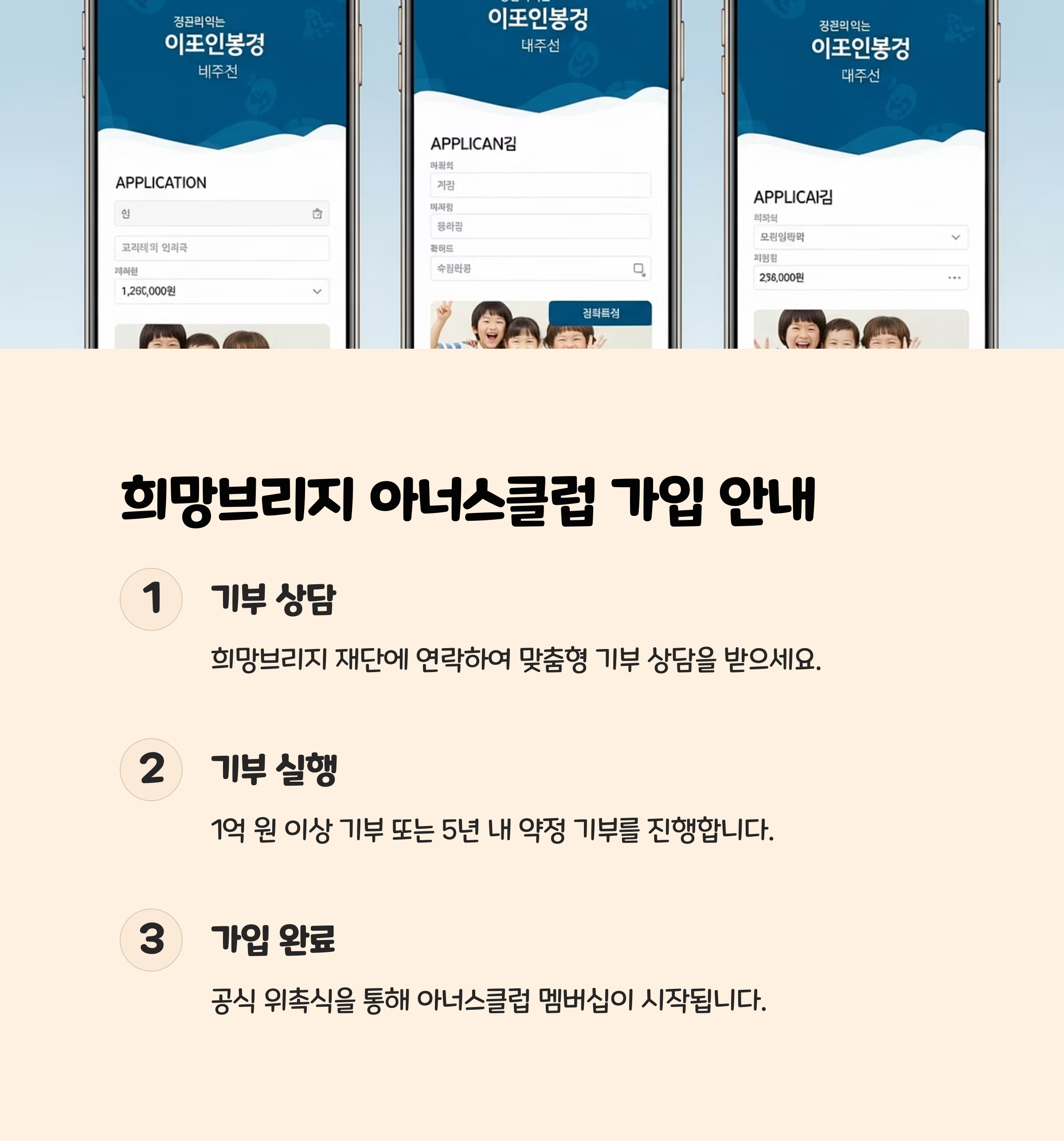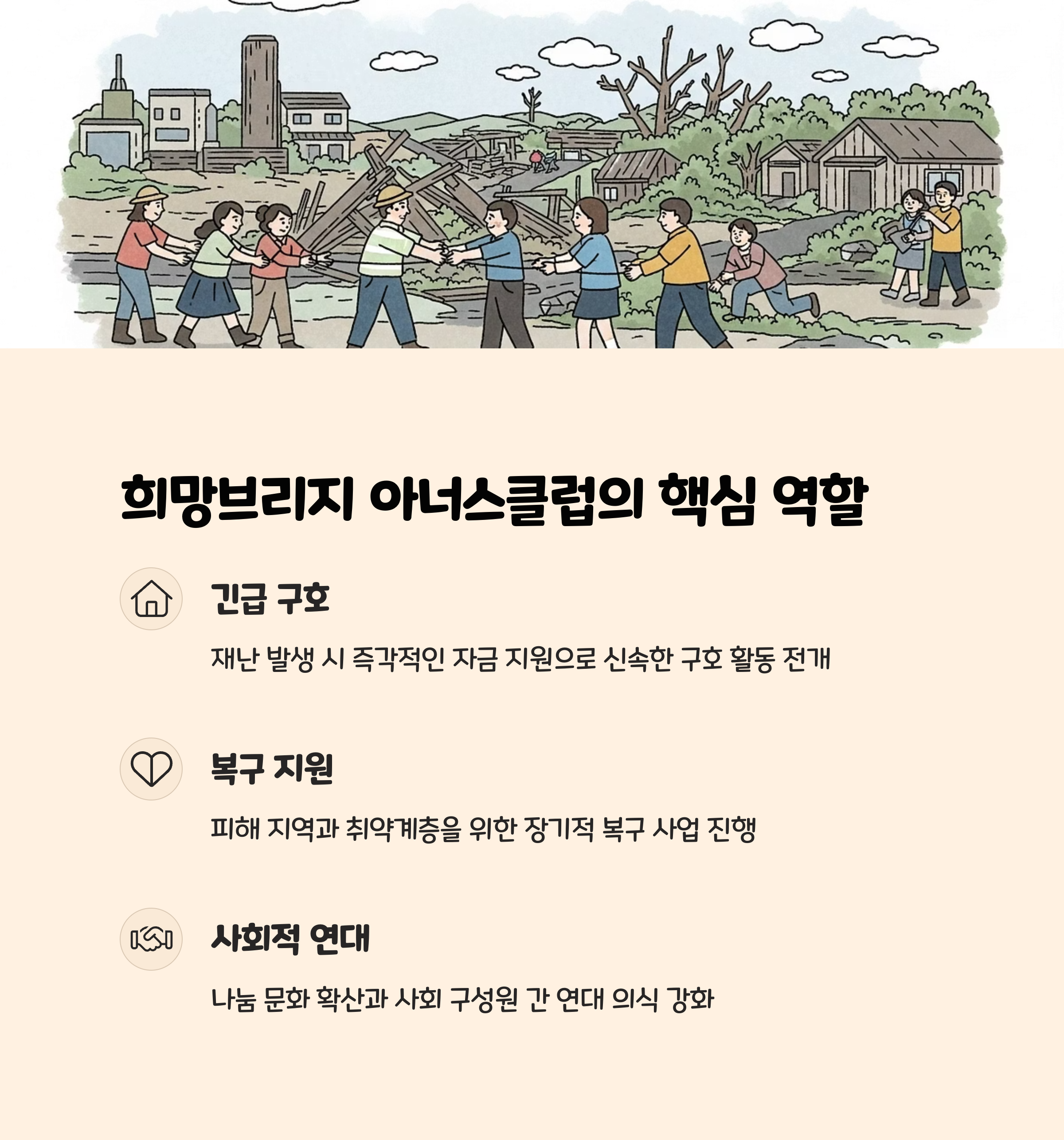 희망브리지 아너스클럽은 한 번에 1억 원 이상을 기부하거나 5년 내 1억 원 이상을 약정한 개인 고액 기부자들이 모인 네트워크입니다. 이 모임은 재난 피해 이웃의 일상 회복을 돕고, 나눔 문화를 확산하는 리더 역할을 합니다.