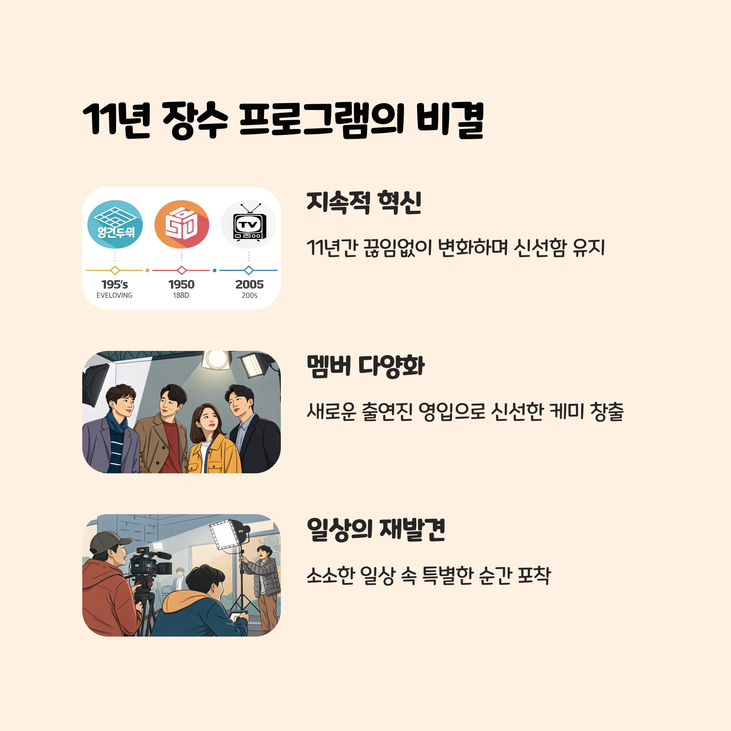 JTBC, SBS, KBS 등 주요 방송사들도 스핀오프와 시즌제를 통해 새로운 재미를 선사하며, 예능의 진화와 변화를 이끌었습니다. 각 프로그램마다 최고의 시청률 장면에서는 출연진의 진솔한 리액션과 예상치 못한 상황이 시청자들의 공감을 자아냈다는 공통점이 있습니다.