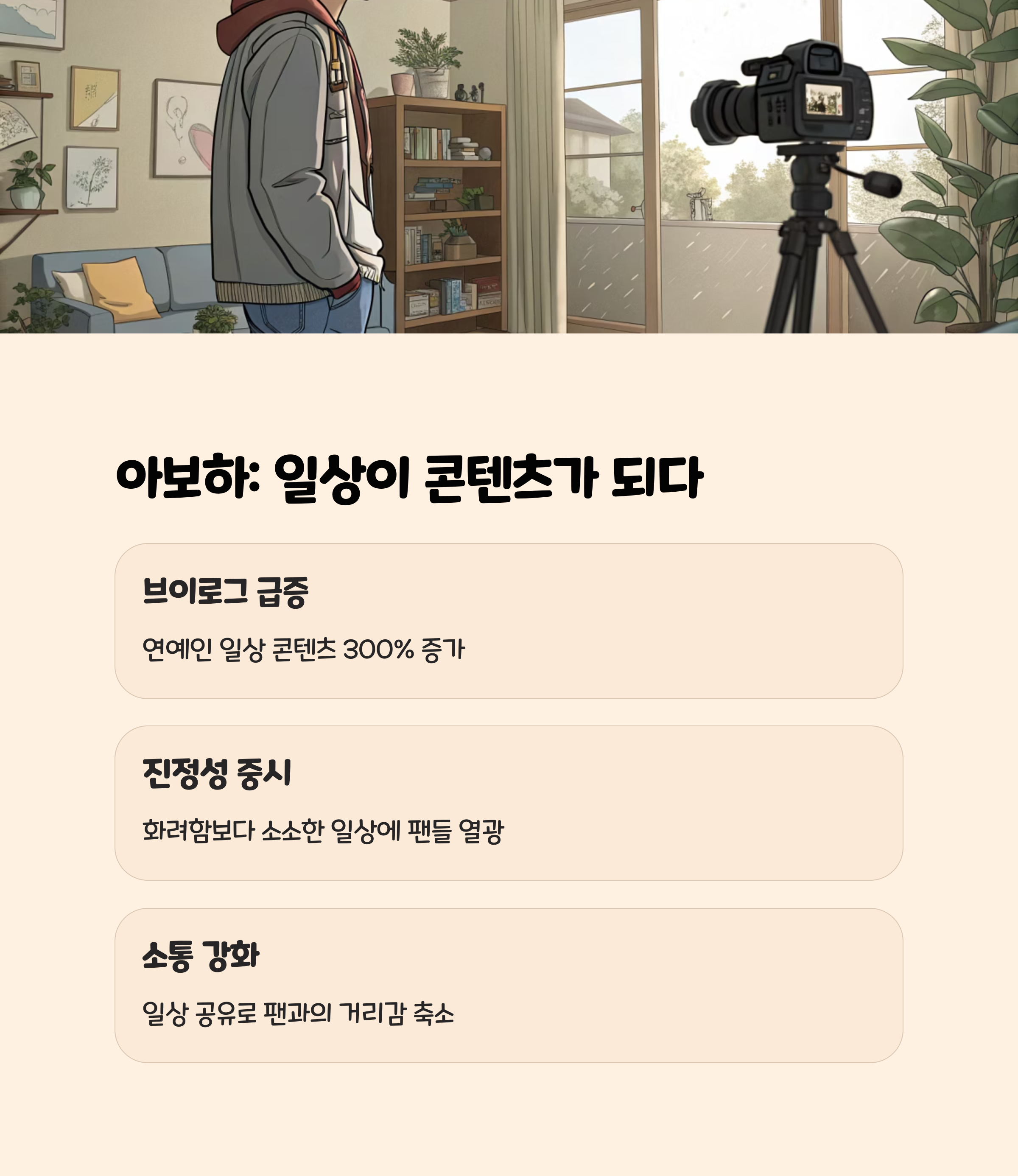 2025년 연예계에서 가장 자주 언급된 키워드 중 하나는 바로 **‘아보하’(아주 보통의 하루)**입니다. 이 단어는 특별한 사건이나 성공이 없어도, 평범한 하루를 감사하며 살아가는 태도를 의미합니다. SNS에서는 화려한 일상보다 가족과 함께하는 소소한 시간, 혼자 집에서 보내는 평범한 하루를 공유하는 콘텐츠가 크게 늘었습니다. 연예인들도 일상 브이로그, 집콕 라이프 등 ‘아보하’ 트렌드를 반영한 콘텐츠를 활발히 선보이고 있습니다.