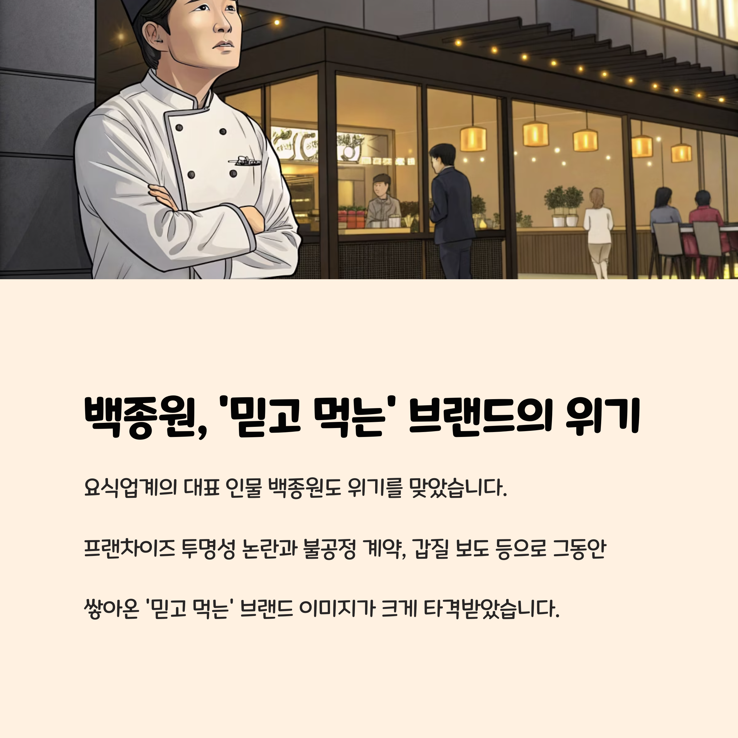 백종원은 프랜차이즈 가맹점 운영 방식과 불공정 계약 조건에 대한 가맹점주들의 집단 불만이 언론에 집중 보도되면서 이미지가 급격히 하락했습니다. 소비자들의 불매 운동과 브랜드 신뢰도 하락이 동반되어 큰 타격을 받았습니다.
