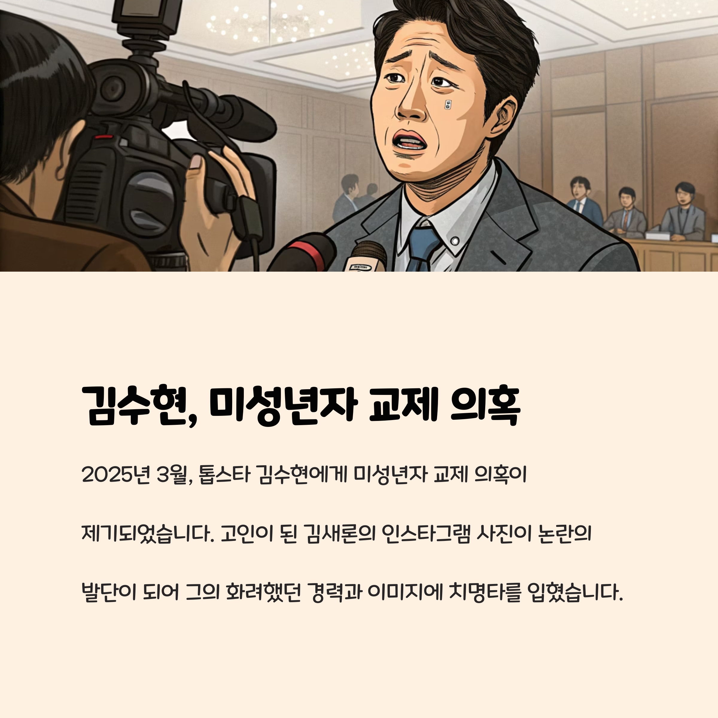 2025년 상반기 연예계 최대 이슈는 단연 배우 김수현과 고(故) 김새론을 둘러싼 논란이었습니다. 김새론의 갑작스러운 사망(2025년 2월 16일) 이후, 미성년자 시절 그루밍 의혹과 사생활 폭로가 이어졌고, 김수현이 아동복지법 위반 혐의로 지목되면서 사회 전체가 충격에 빠졌습니다. 이 논란으로 김수현은 모든 활동을 중단했고, 해외 광고 계약이 줄줄이 취소되며 수십억 원대 손실을 입었습니다.