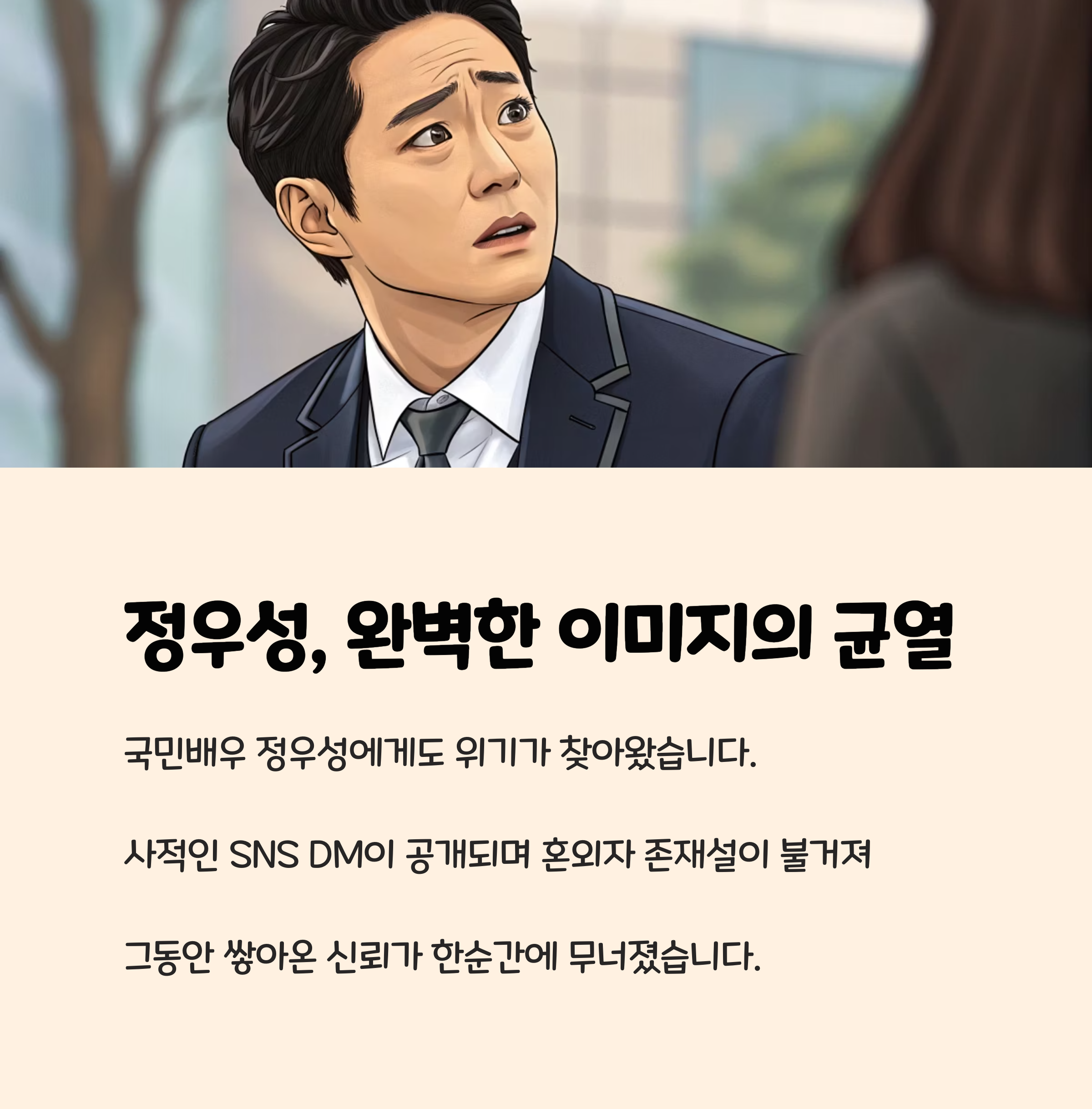 그러나 이후 정우성이 일반인 여성들에게 SNS 다이렉트 메시지로 호감을 표현한 사실이 폭로되며 여론은 급격히 악화됐습니다. 특히 장기 연애 중이던 비연예인 여자친구의 존재, 여성과의 스킨십 사진, 영상 유출 등이 연이어 터지면서 “젠틀한 이미지”는 한순간에 무너졌습니다. 정우성의 DM은 온라인에서 ‘밈’으로 확산되며 대중의 실망감이 커졌고, 함께 작품을 했던 배우들까지 루머와 피해를 입는 등 파장이 컸습니다. 30년 가까이 쌓아온 신뢰가 SNS 한 방에 무너진 대표적 사례로 남았습니다.
