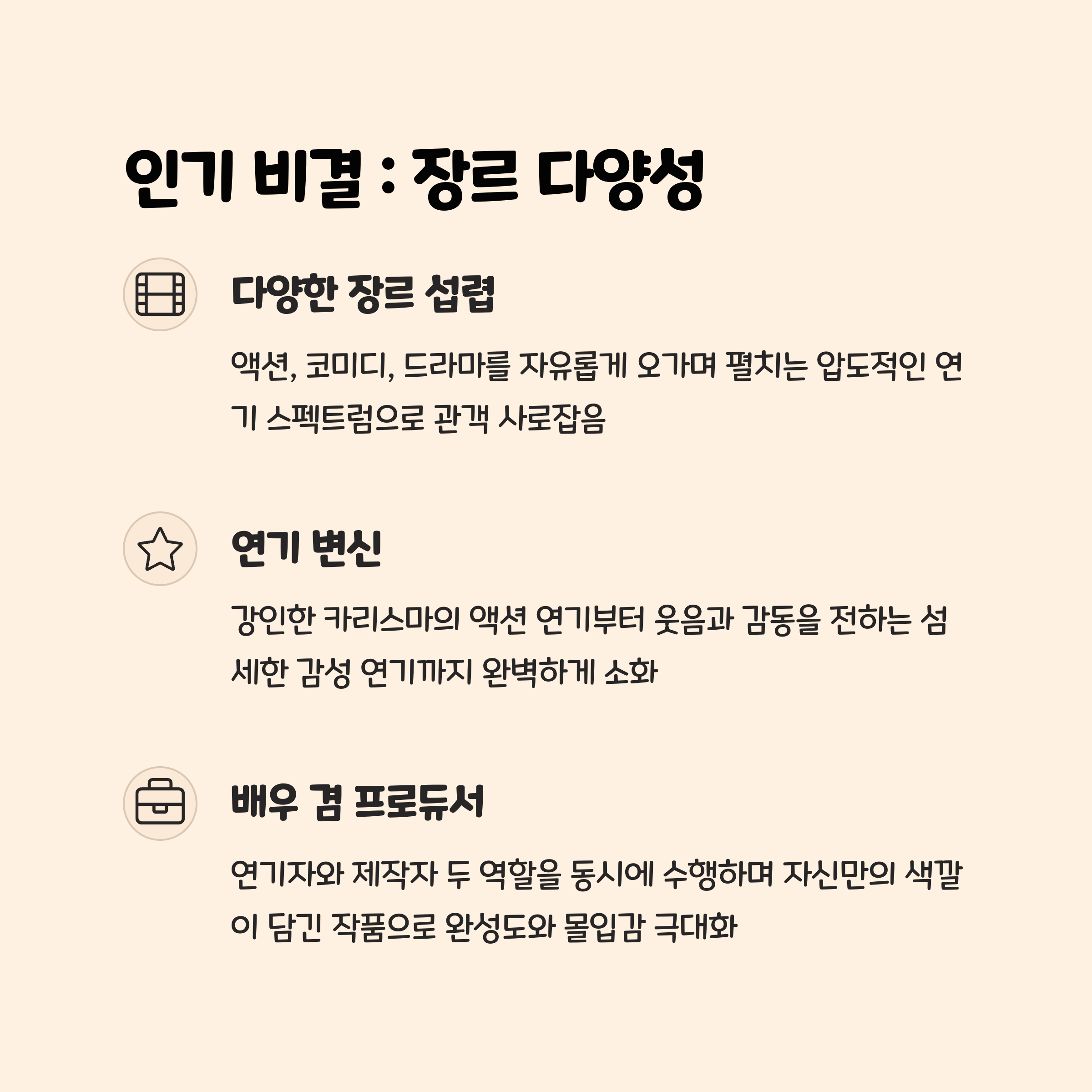 마동석은 액션뿐 아니라 오컬트, 코미디, 드라마 등 다양한 장르에서 활약하고 있습니다. 특히 2025년 개봉한 ‘거룩한 밤: 데몬 헌터스’는 오컬트 액션 장르로, 마동석의 새로운 연기 변신이 돋보였다는 평을 받았습니다. 또한, 하반기에는 KBS 드라마 ‘트웰브’ 주연으로 캐스팅되어 또 다른 도전을 예고하고 있습니다.