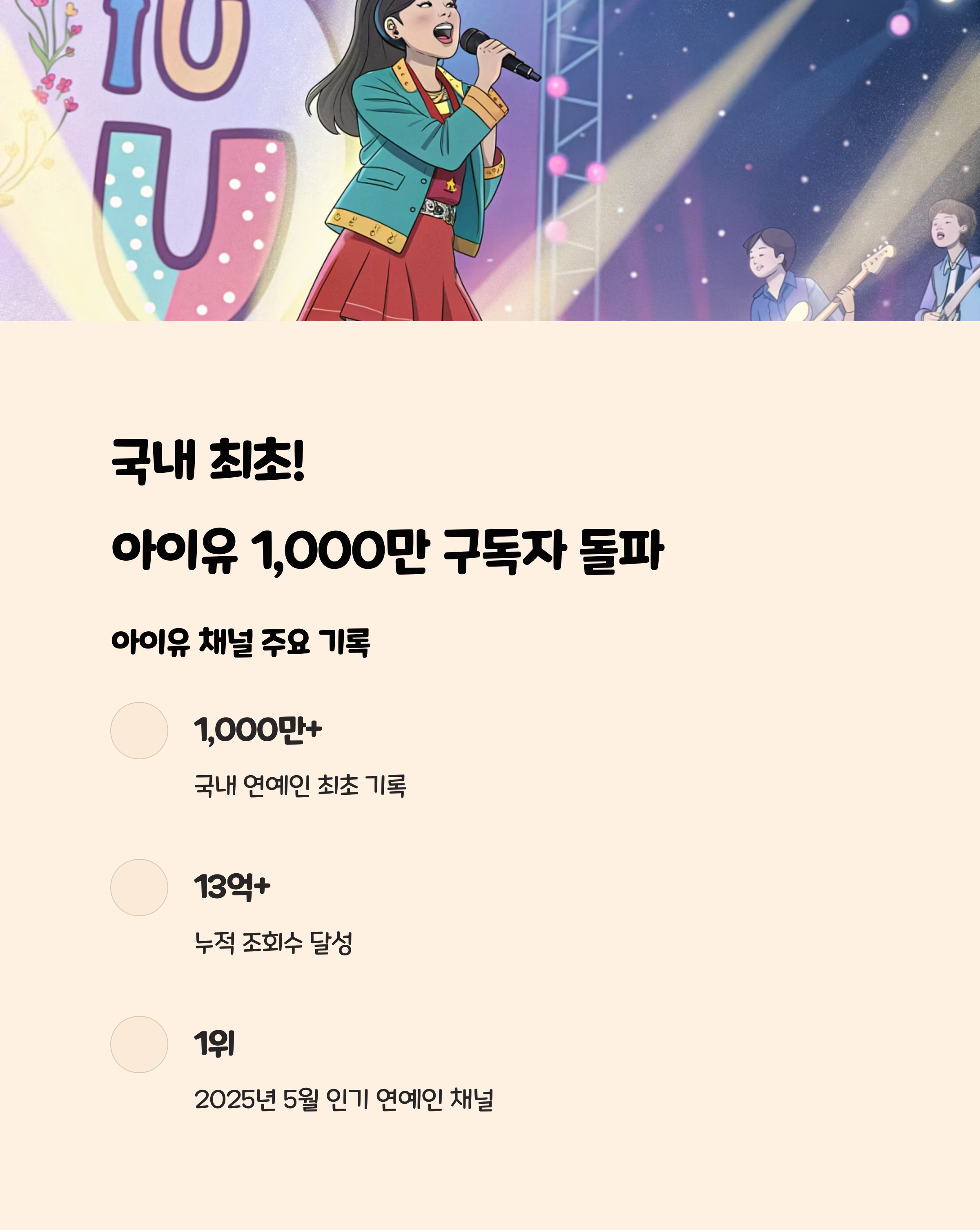 | 1 | 이지금 [IU Official] | 아이유 | 1,000만+ | 브이로그, 뮤직비디오, 예능 |