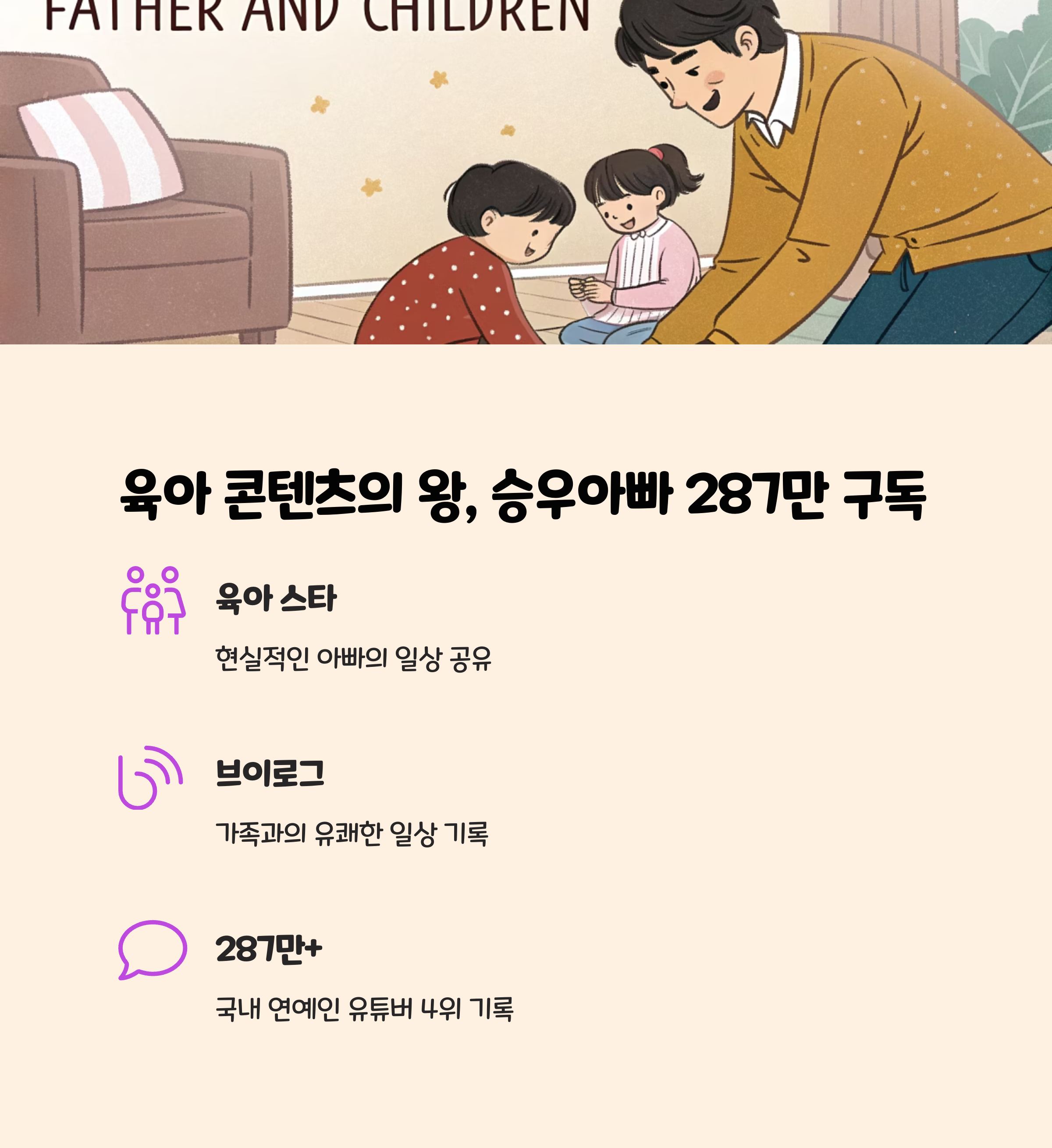 | 4 | 승우아빠 | 승우아빠 | 287만+ | 요리, 일상 브이로그 |