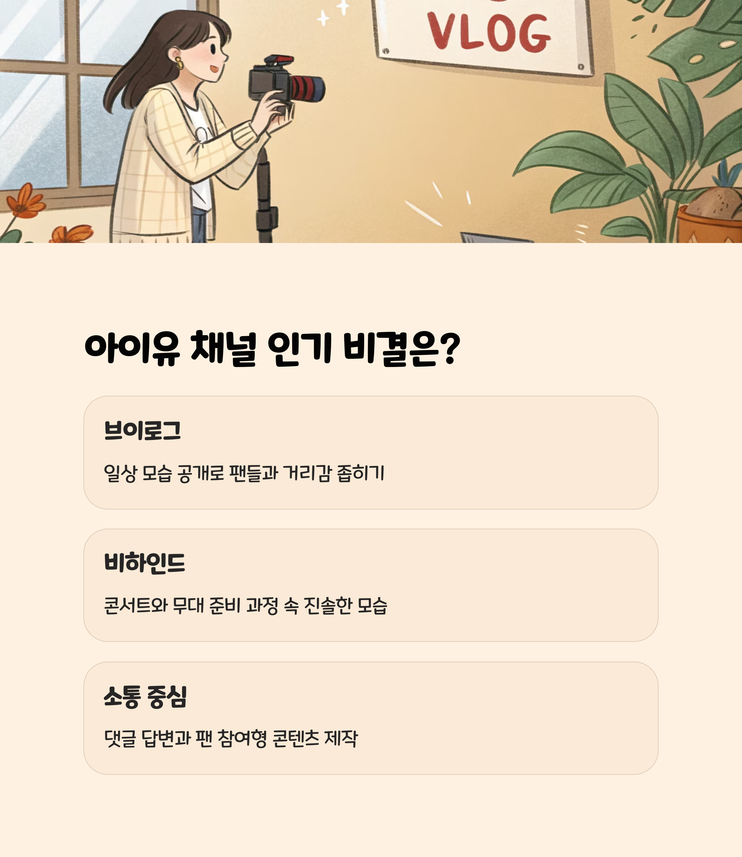 - 이러한 콘텐츠는 연예인의 무대 밖 자연스러운 모습과 일상, 소소한 경험을 공유해 시청자와의 심리적 거리를 좁혀줍니다.