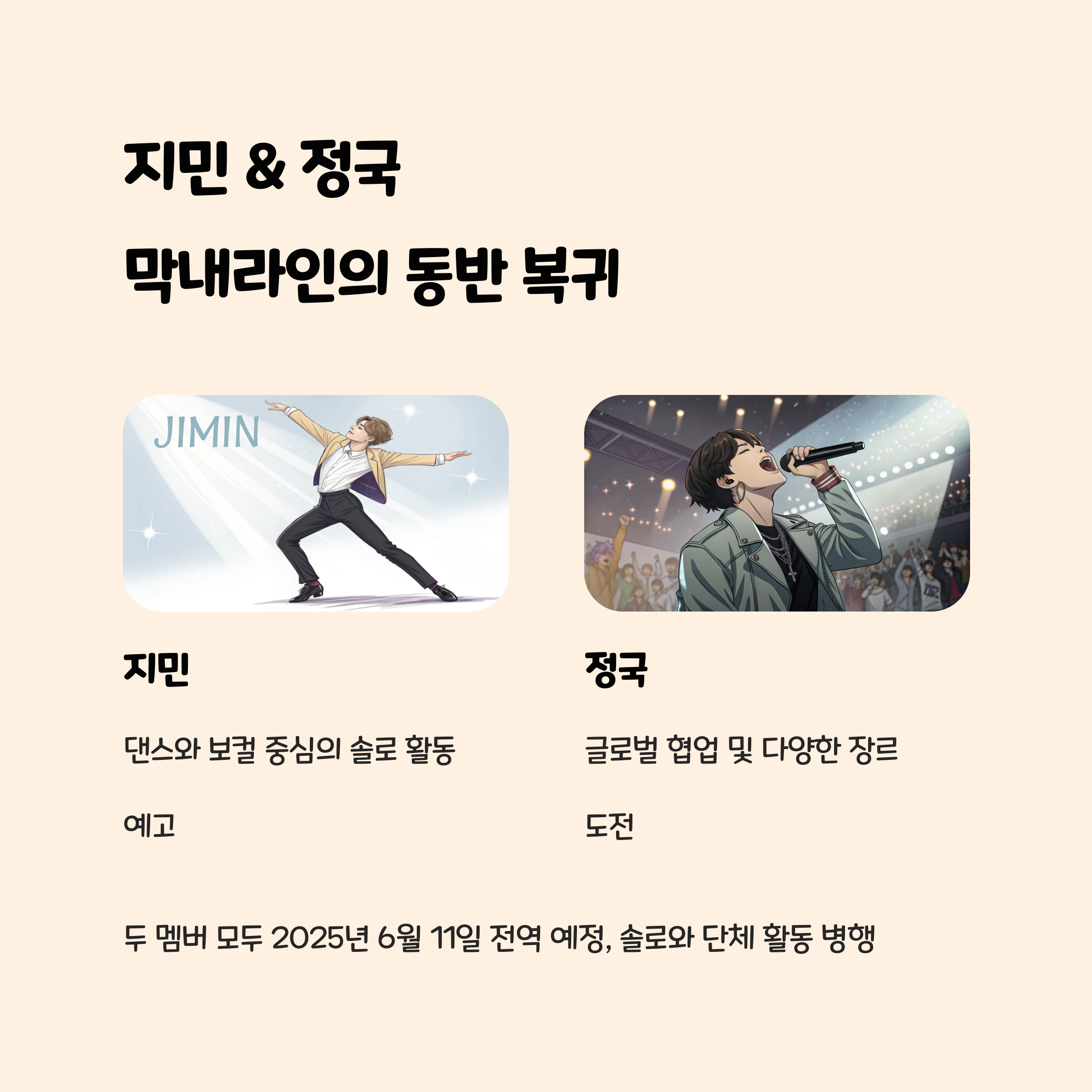 2025년 5월을 기점으로, 군 복무를 마친 연예인들의 본격적인 활동이 시작됩니다. 특히 BTS를 비롯한 글로벌 스타들의 컴백은 K-POP의 새로운 도약을 예고하고 있습니다. 팬들과 대중 모두가 기다려온 이 순간, 앞으로 어떤 새로운 기록과 감동을 만들어낼지 기대해봅니다.