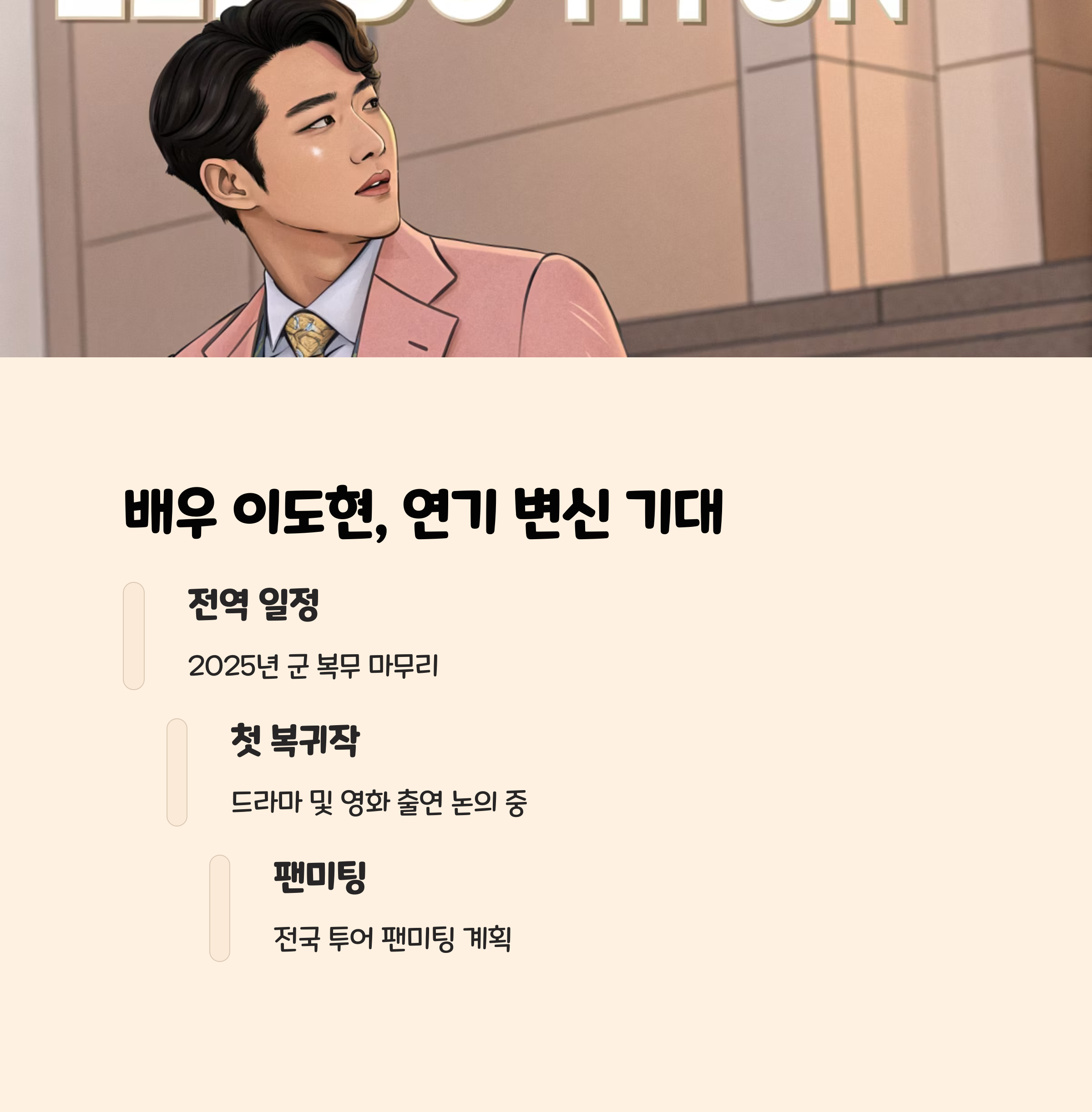 드라마와 영화에서 활약한 배우 이도현 역시 5월 전역 예정으로, 차기작에 대한 기대가 높습니다.