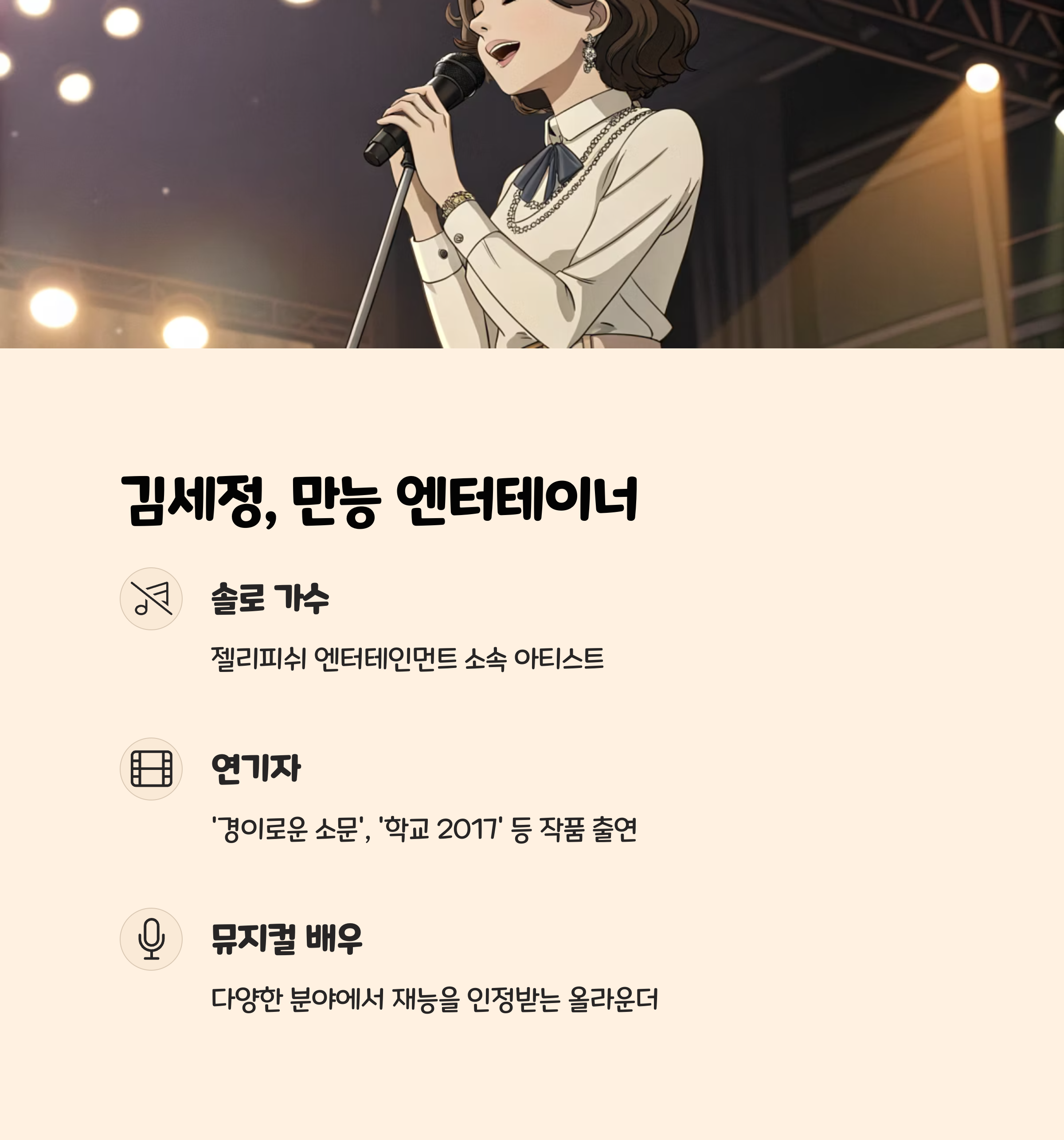 - 김세정 : 배우와 가수 활동을 병행. 2025년 상반기 인기 드라마 주연, OST도 직접 불러 화제.