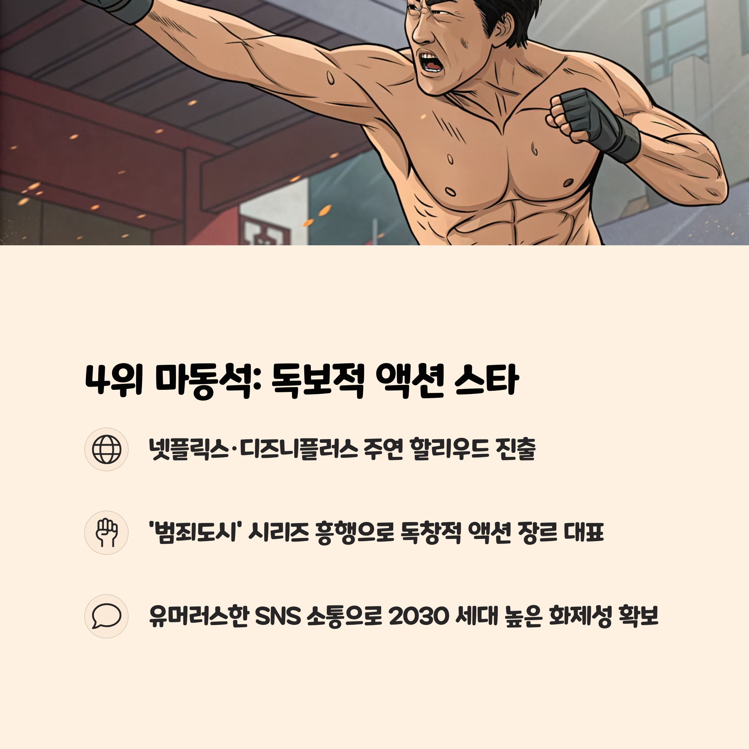 마동석은 2025년 5월 영화배우 브랜드평판 1위를 기록하며, 영화 ‘거룩한 밤: 데몬 헌터스’와 예능 ‘아이 엠 복서’ 등 다양한 분야에서 활약 중입니다. 참여지수 50만, 커뮤니티지수 185만 등 전 영역에서 고른 점수와 84.28%의 긍정비율을 기록했습니다. 특유의 강인한 이미지와 오컬트 액션 장르에서의 독보적 존재감이 강점입니다.
