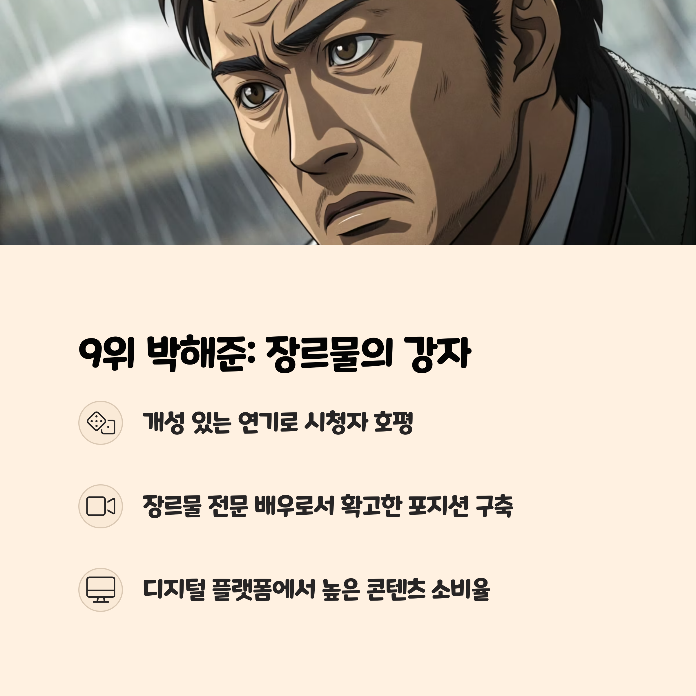박해준은 최근 출연작에서 깊이 있는 연기를 선보이며 중견 배우로서의 입지를 확고히 했습니다. 진중한 캐릭터와 현실적인 연기 톤으로 시청자들에게 깊은 인상을 남기고 있습니다.