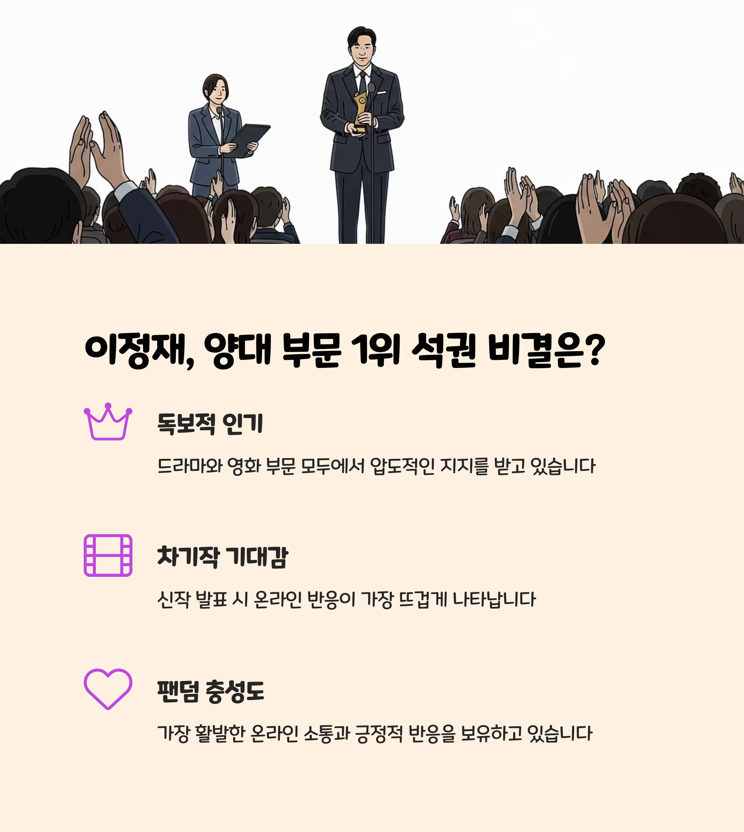 이정재 배우는 참여지수 257,915, 미디어지수 318,563, 소통지수 1,788,986, 커뮤니티지수 2,205,157로 집계되어 1위를 기록했습니다. 주요 연관 키워드 분석 결과는 ‘전작의 성공’, ‘차기작 기대’, ‘팬덤의 화력’ 등 긍정적 키워드가 높은 점수를 차지했고, 긍·부정 감성 비율에서도 긍정 평가가 압도적이었습니다.