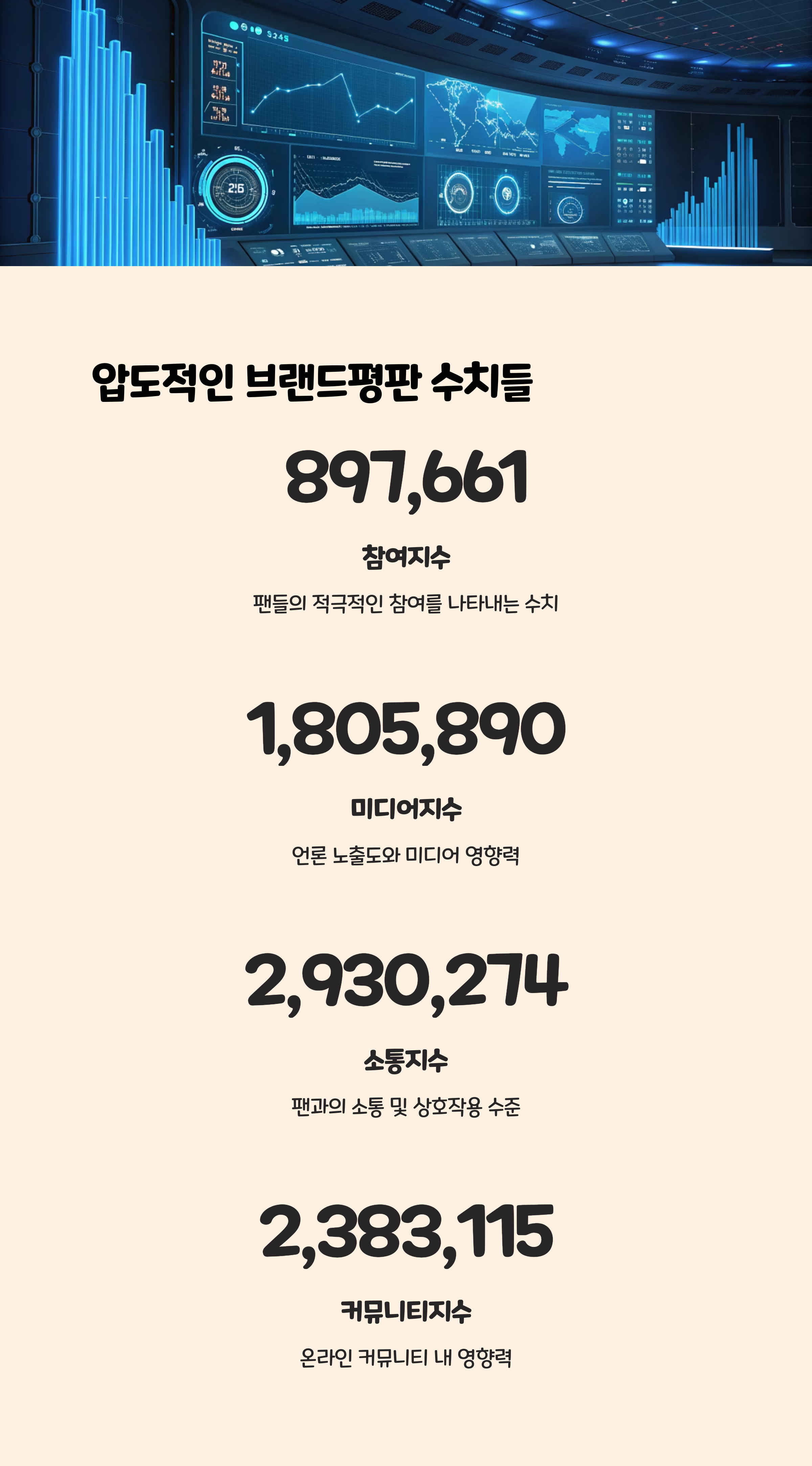 브랜드 평판 1위는 한국기업평판연구소에서 소비자들의 온라인 행동, 미디어 노출, 커뮤니티 반응 등 다양한 빅데이터를 분석해 산출하는 순위입니다. 이는 대중의 관심도와 긍정적 이미지를 종합적으로 평가해 발표하는 지표로, K팝 아티스트의 사회적 영향력과 인기도를 객관적으로 보여줍니다.
