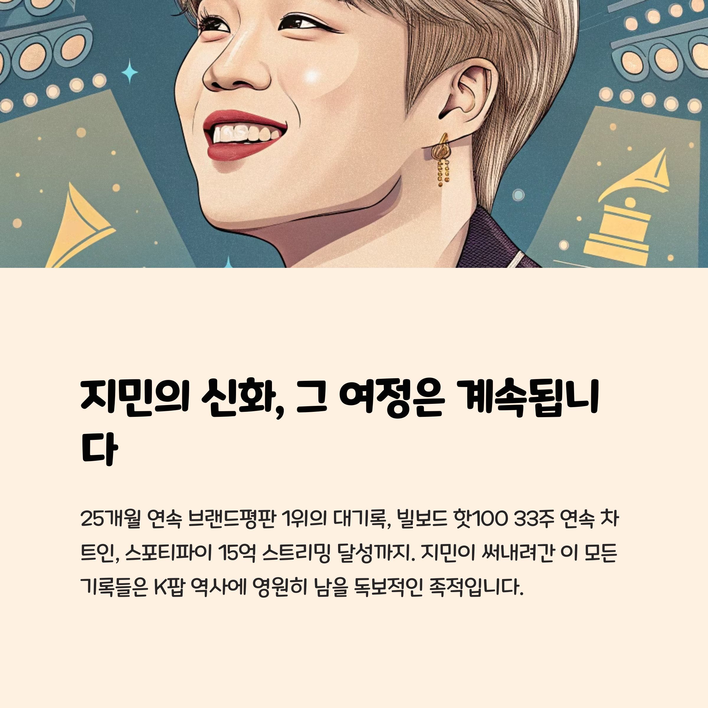 지민의 25개월 연속 1위, 그리고 글로벌 차트와 시상식에서의 연이은 신기록은 단순한 우연이 아닙니다. 음악적 역량, 팬과의 쌍방향 소통, 사회적 책임감, 그리고 글로벌 트렌드에 대한 민감한 감각까지-이 모든 것이 어우러져 지민만의 브랜드 신화를 완성했습니다.