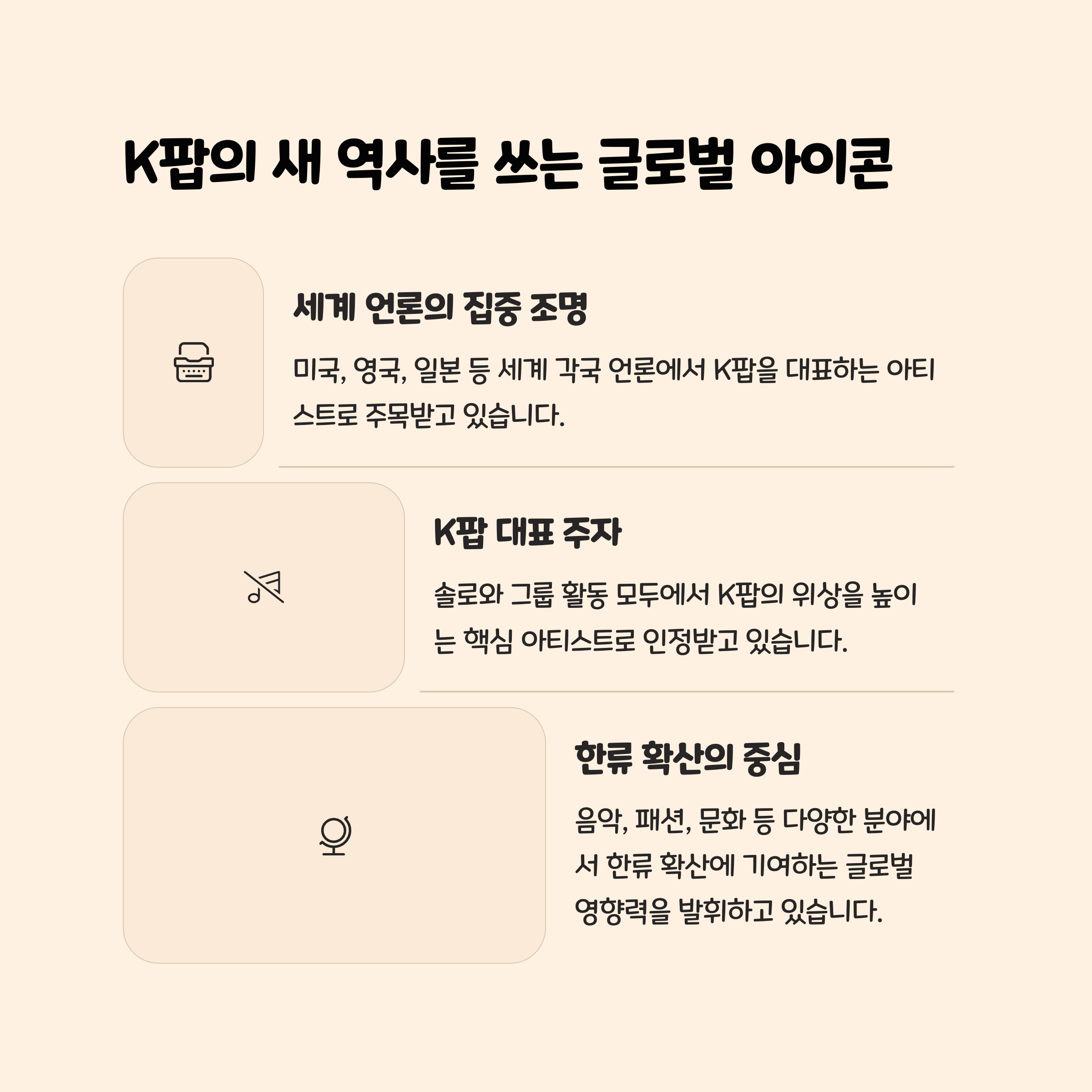 • 그룹 활동을 넘어 솔로 아티스트로서도 전 세계 음악계에서 인정받고 있습니다.