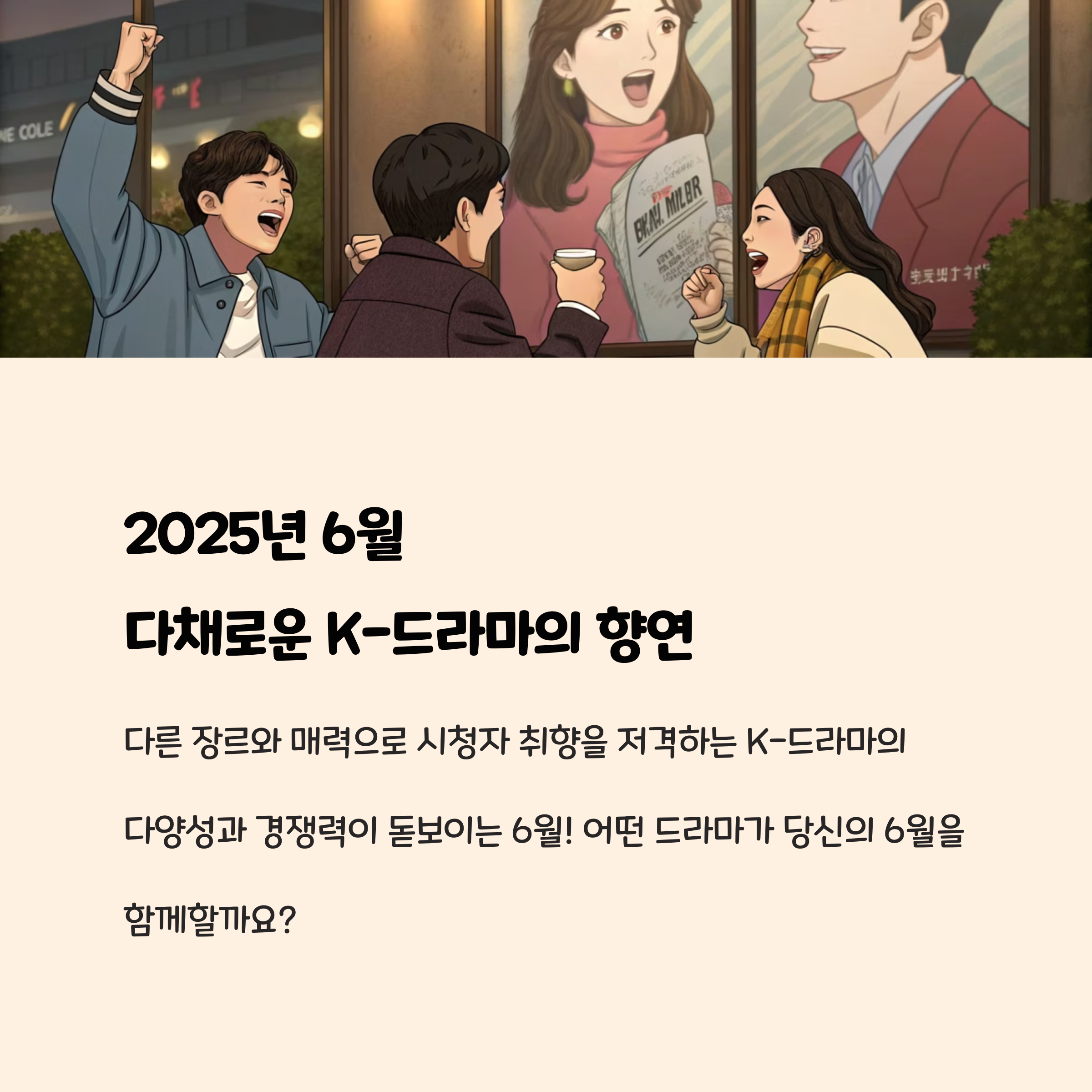 2025년 6월, 각기 다른 매력의 세 작품이 한국 드라마의 저력을 다시 한번 보여줍니다. 취향에 따라 골라보는 재미, 그리고 모두 챙겨보는 행복까지! 당신의 6월을 책임질 최고의 드라마, 지금부터 미리 체크해 두세요.