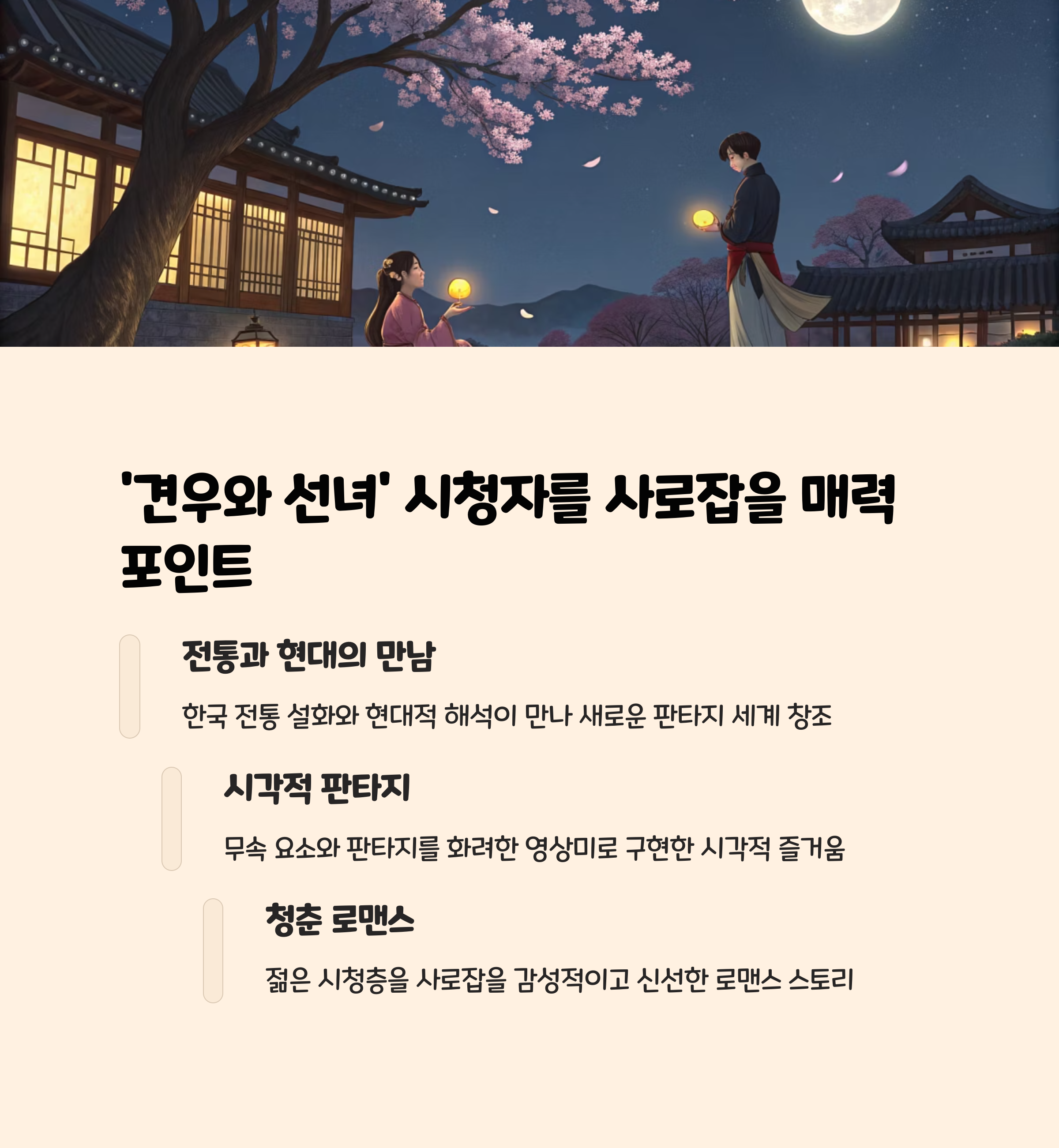 ‘견우와 선녀’는 동명의 인기 웹툰을 원작으로 한 드라마입니다. 원작 웹툰은 현대적 감각으로 재해석된 전통 설화 ‘견우와 직녀’의 모티프를 바탕으로, 운명과 사랑, 청춘의 성장통을 그려내 많은 독자들의 사랑을 받았습니다.