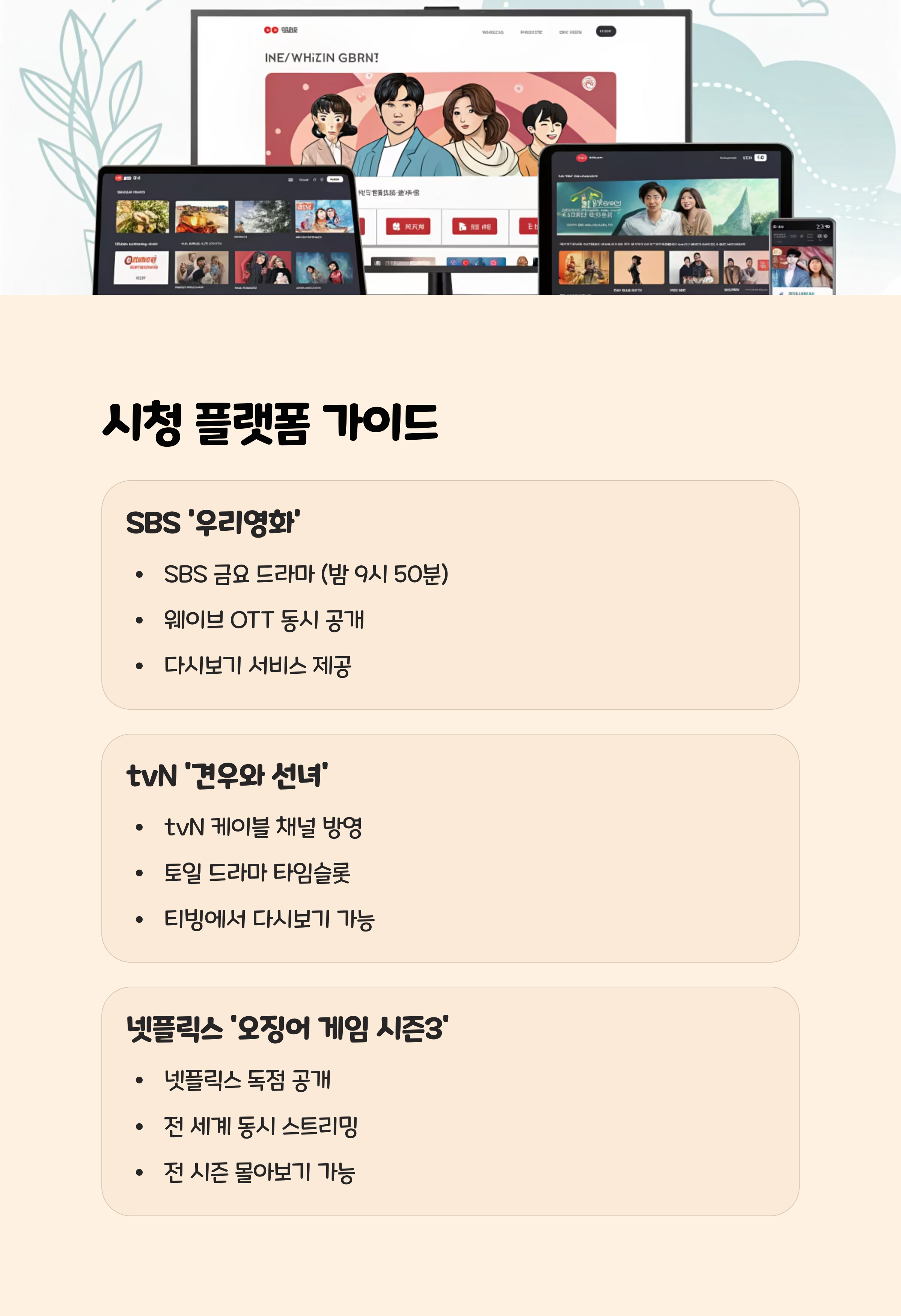 2025년 6월, "볼만한 드라마 뭐 없을까?" 고민하는 분들에게 확실한 해답을 드립니다. 올해 6월은 지상파, 케이블, OTT를 아우르는 초특급 기대작들이 한꺼번에 쏟아지는 달입니다. SBS ‘우리영화’, tvN ‘견우와 선녀’, 넷플릭스 ‘오징어 게임 시즌3’ 이 세 작품은 각기 다른 장르와 감성, 그리고 화제성으로 시청자들의 선택을 기다리고 있습니다. 지금부터 각 작품의 매력과 관전 포인트를 깊이 있게 비교해 드리니, 취향에 맞는 드라마를 미리 골라보세요!