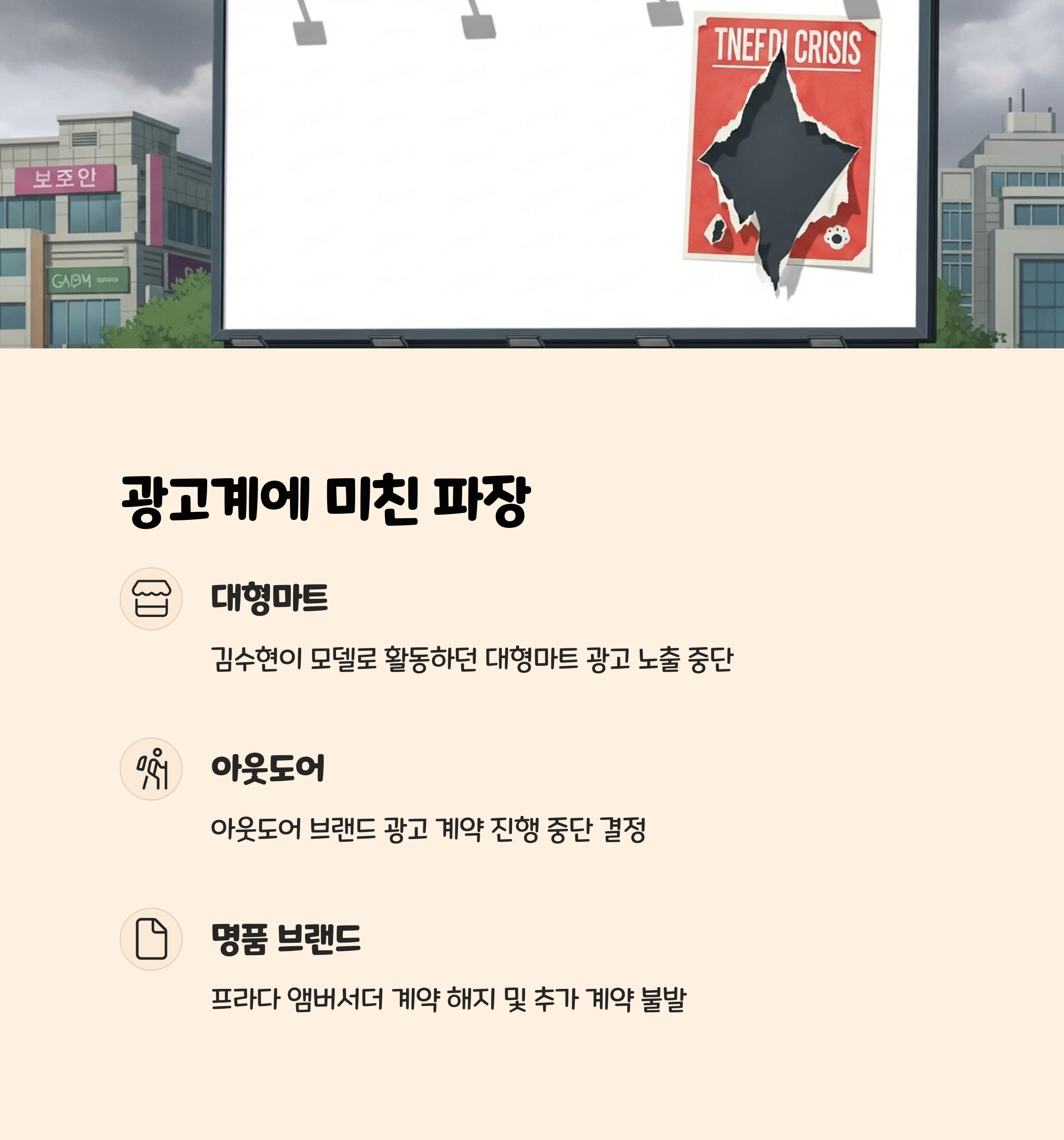 광고업계는 사회적 물의를 일으킬 경우 계약금의 2~3배를 위약금으로 요구하는 조항이 일반적입니다. 김수현의 경우 브랜드당 연간 약 7억 원, 총 220억 원 이상이 추산됩니다.