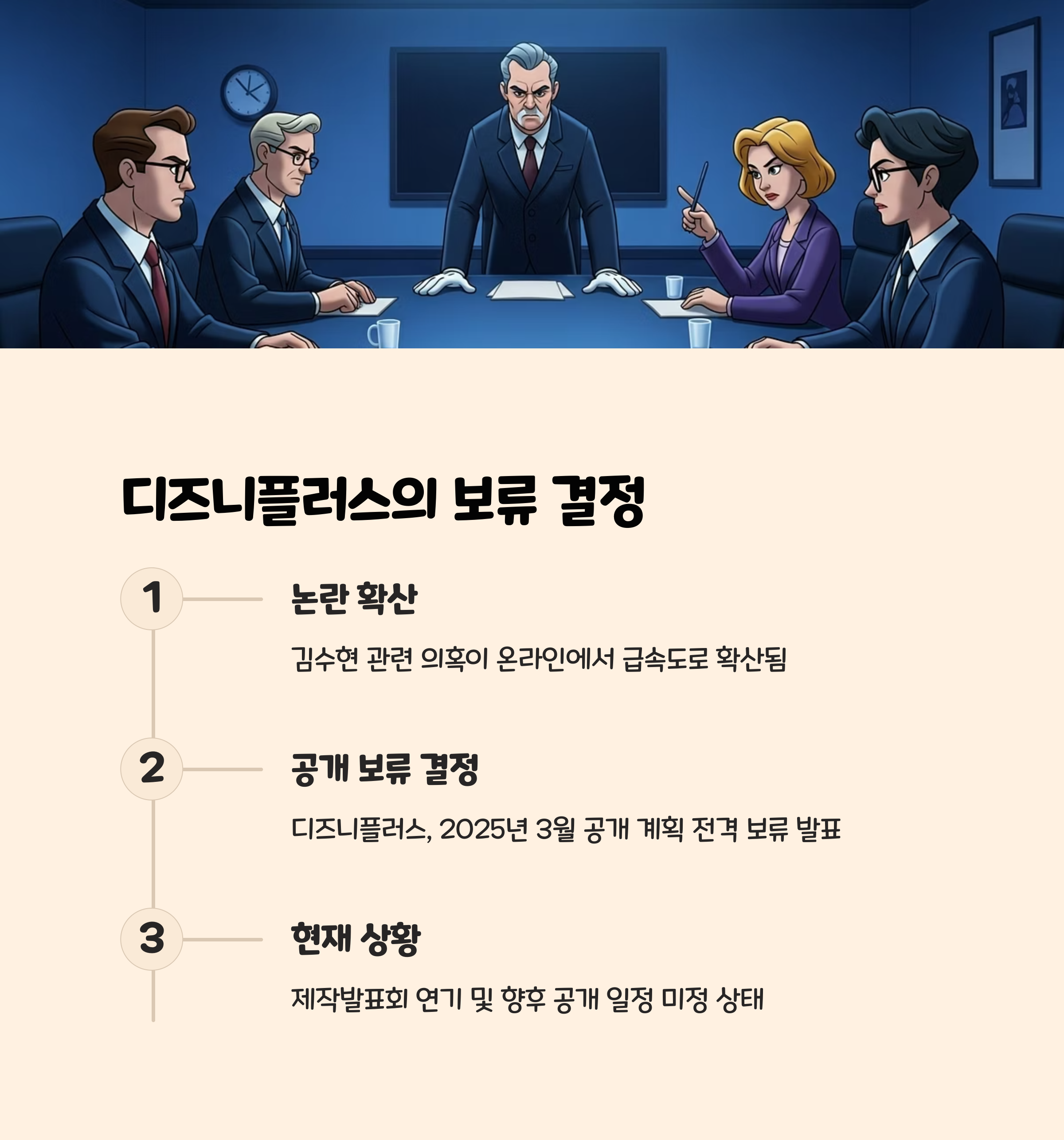 주연 배우 김수현이 과거 미성년자였던 고 김새론과 교제했다는 논란이 불거지면서, 디즈니플러스는 신중한 검토 끝에 넉오프의 공개를 잠정 보류하기로 결정했습니다. 이는 사회적 파장과 브랜드 신뢰도 하락을 우려한 조치입니다.