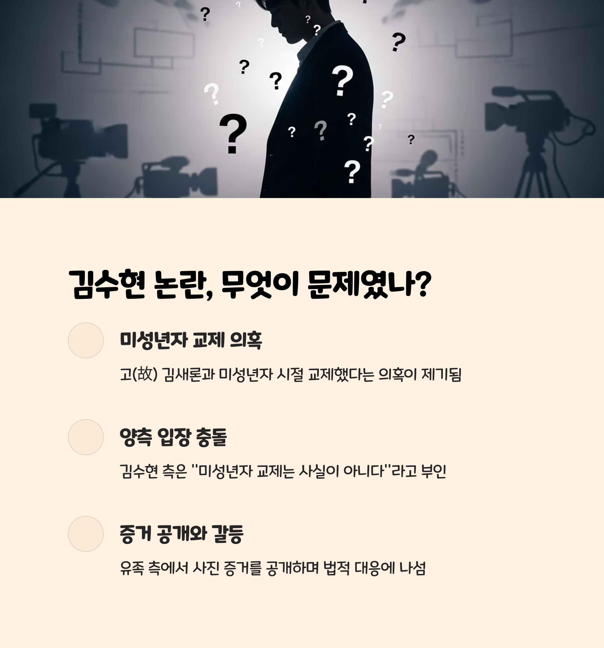 김수현은 기자회견을 통해 “고인이 미성년자였던 시절 교제한 사실이 없다”며 강하게 부인했고, 유족과 유튜버 등을 상대로 법적 대응에 나섰습니다.