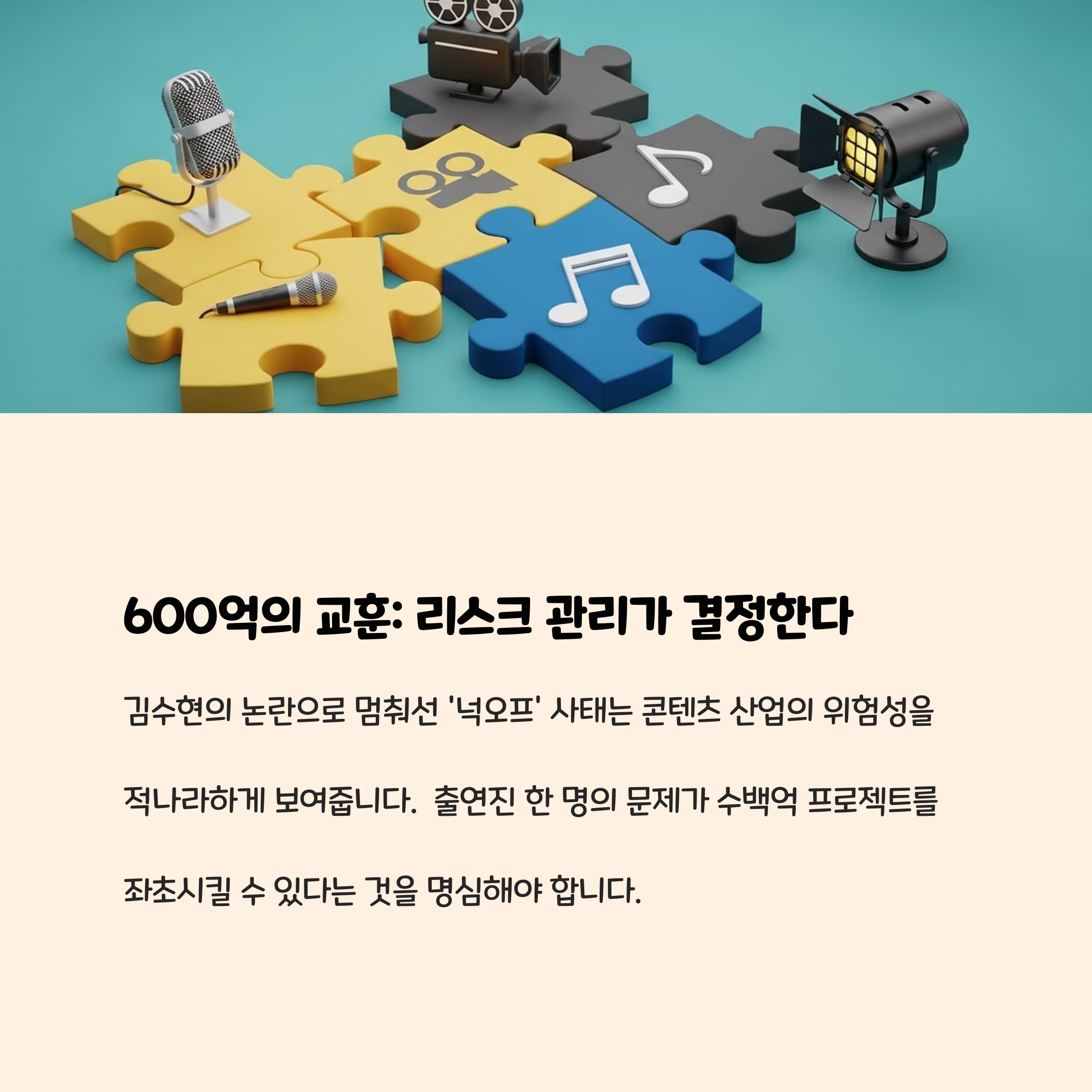 600억 원이 넘는 제작비와 대규모 위약금 가능성, 그리고 광고주들의 줄줄이 계약 해지 등은 콘텐츠 산업의 리스크 관리 필요성을 다시 한 번 일깨워 줍니다. 실제로 ‘넉오프’ 사태 이후, 여러 제작사와 광고주들은 출연진 리스크에 대한 계약 조항 강화와 사전 검증 절차를 한층 엄격히 하고 있습니다.